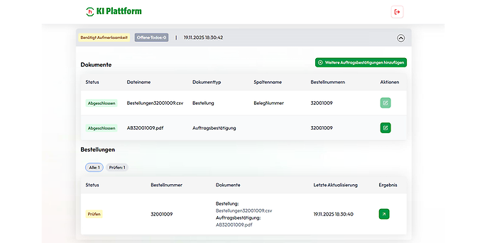 - Multiupload: Previously, only the documents for a single order could be uploaded. In the MVP, it is possible to process multiple orders at the same time. To do this, the documents are first uploaded to cloud storage. Firestore then records which orders already have data available, what is missing and what the status of the comparison is.